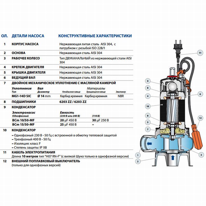 Ýëåêòðîíàñîñ ïîãðóæíîé äëÿ êàíàëèçàöèîííûõ âîä ñ äâóõêàíàëüíûì ðàáî÷èì êîëåñîì Pedrollo BCm 10/50 ST êàáåëü 5ì, ñ êîðïóñîì èç íåðæàâåþùåé ñòàëè, ýòî íîâàÿ ìîäåëü, êîòîðàÿ ïðèøëà íà ñìåíó ðàíåå âûïóñêàâøåéñÿ ïîïóëÿðíîé ìîäåëè MCm 10/50-I (INOX).
